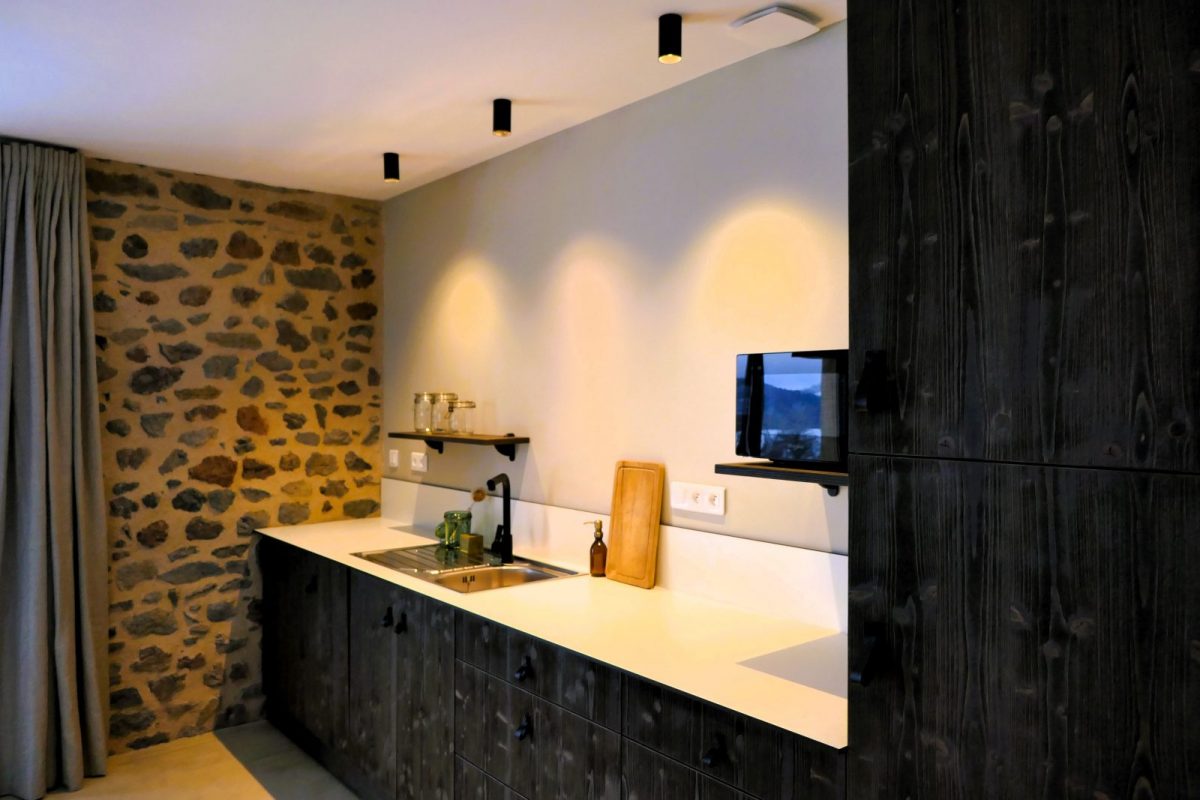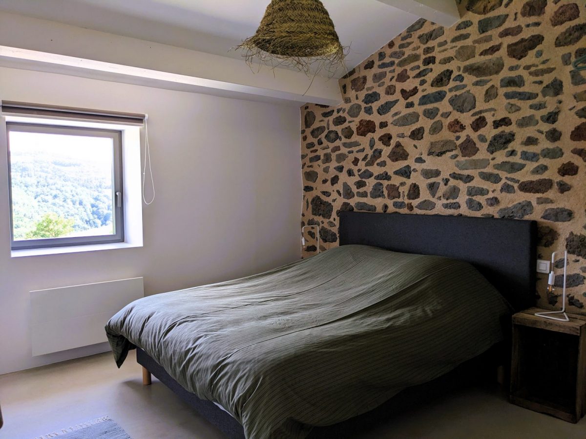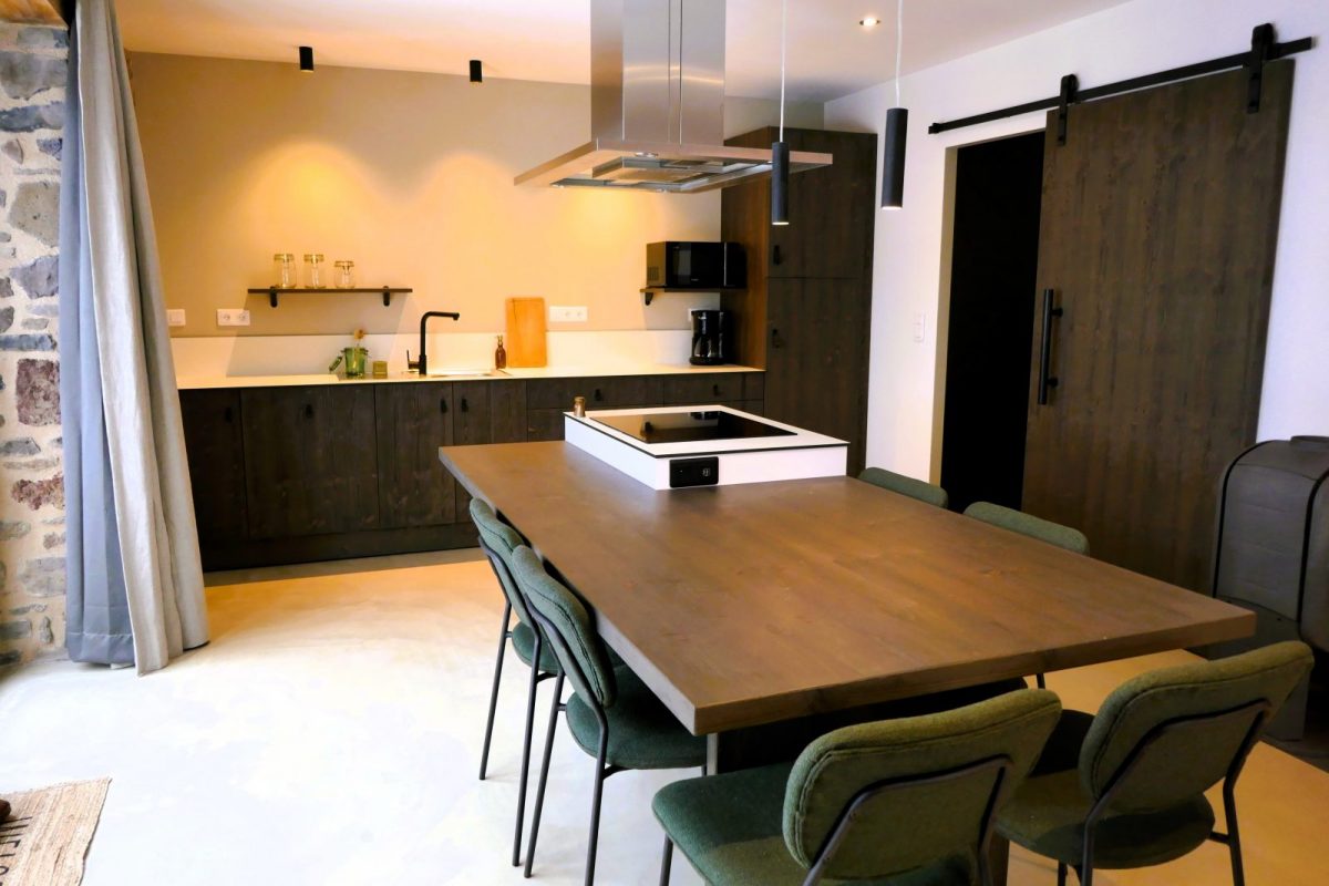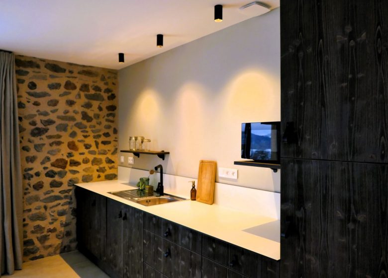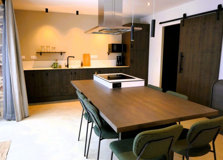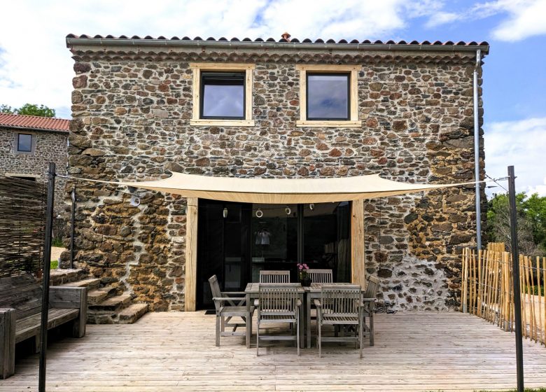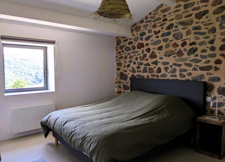 Ce bâti a été rénové avec une sensibilité écologique (utilisation de matériaux nobles : bois, pierre, acier, …, isolation et peintures écologiques, sols en béton ciré, quelques meubles anciens détournés et/ou relookés (tables nuit, commodes, etc …), clôture extérieur en bois local (noisetier et châtaignier), tri sélectif proposé, composteur dans la propriété, produits d'accueil gel douche corps & cheveux et produits d’entretien écologiques, …