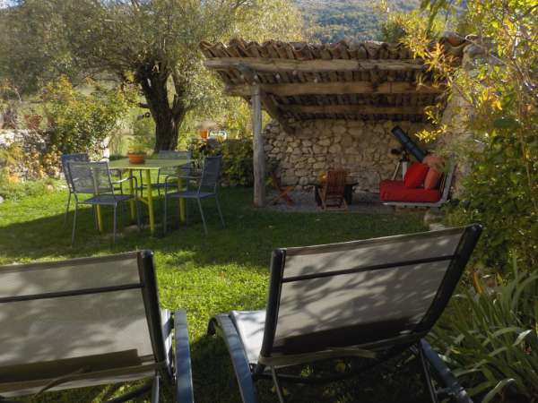 Cour en lauzes, non fermée, ombragée en saison, avec mobilier de jardin et barbecue.