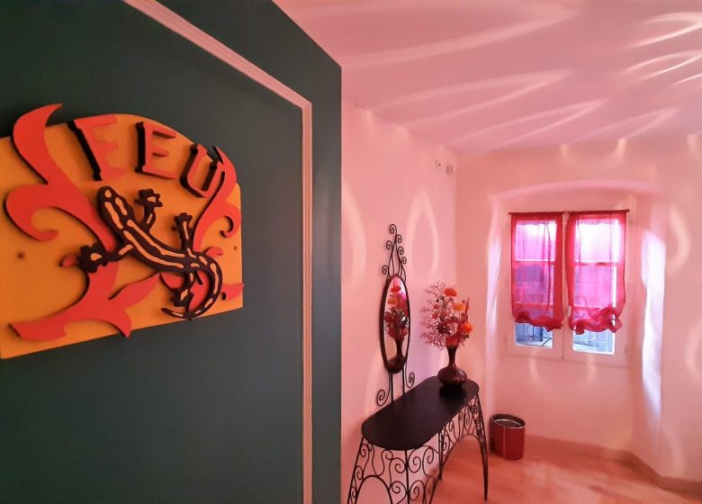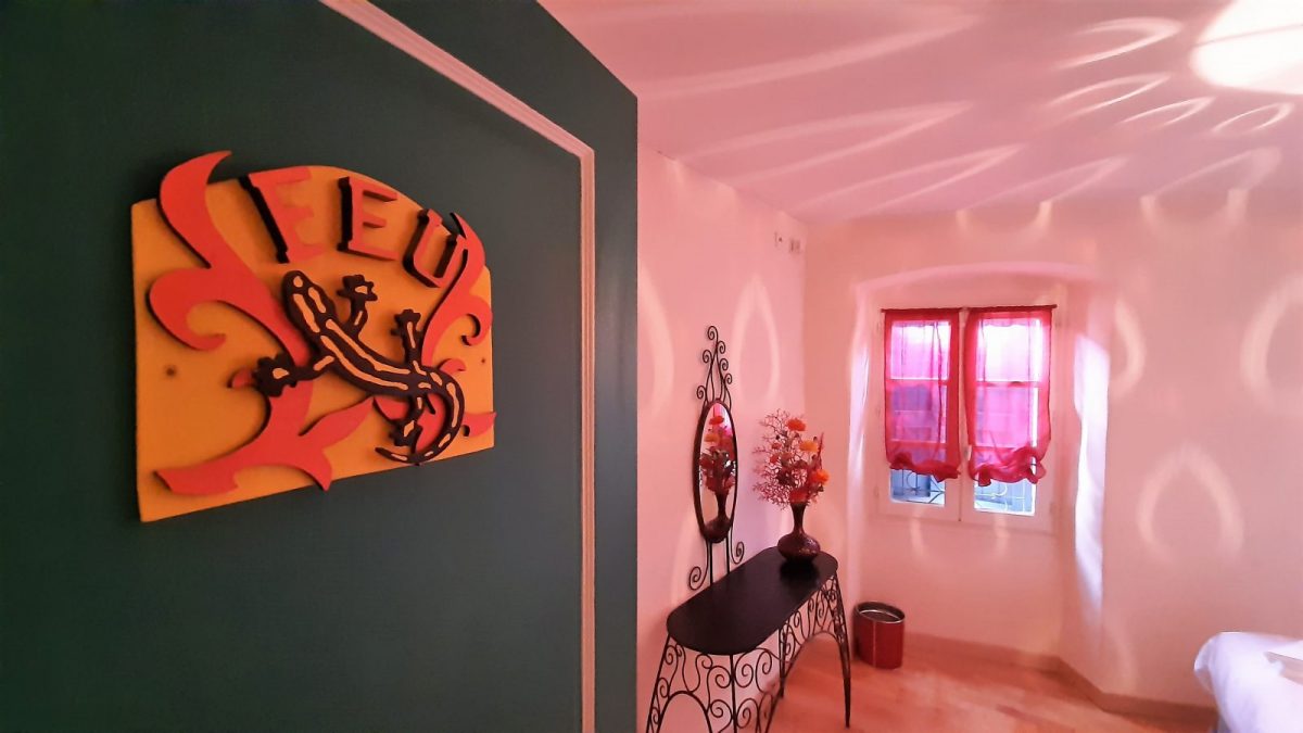 ►Chambre Feu (15 m2), 2 fenêtres ouvrant sur l’extérieur : chambre double (2 lits 1 pers. en 90x190 cm ou possibilité de réunir les lits en un seul grand lit en 180x190 cm). Salle d'eau privative mais non attenante à coté de la chambre avec douche, lavabo et WC.