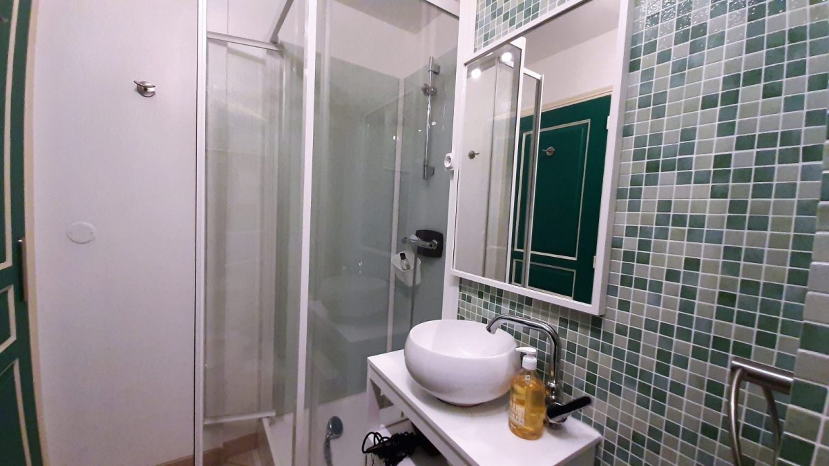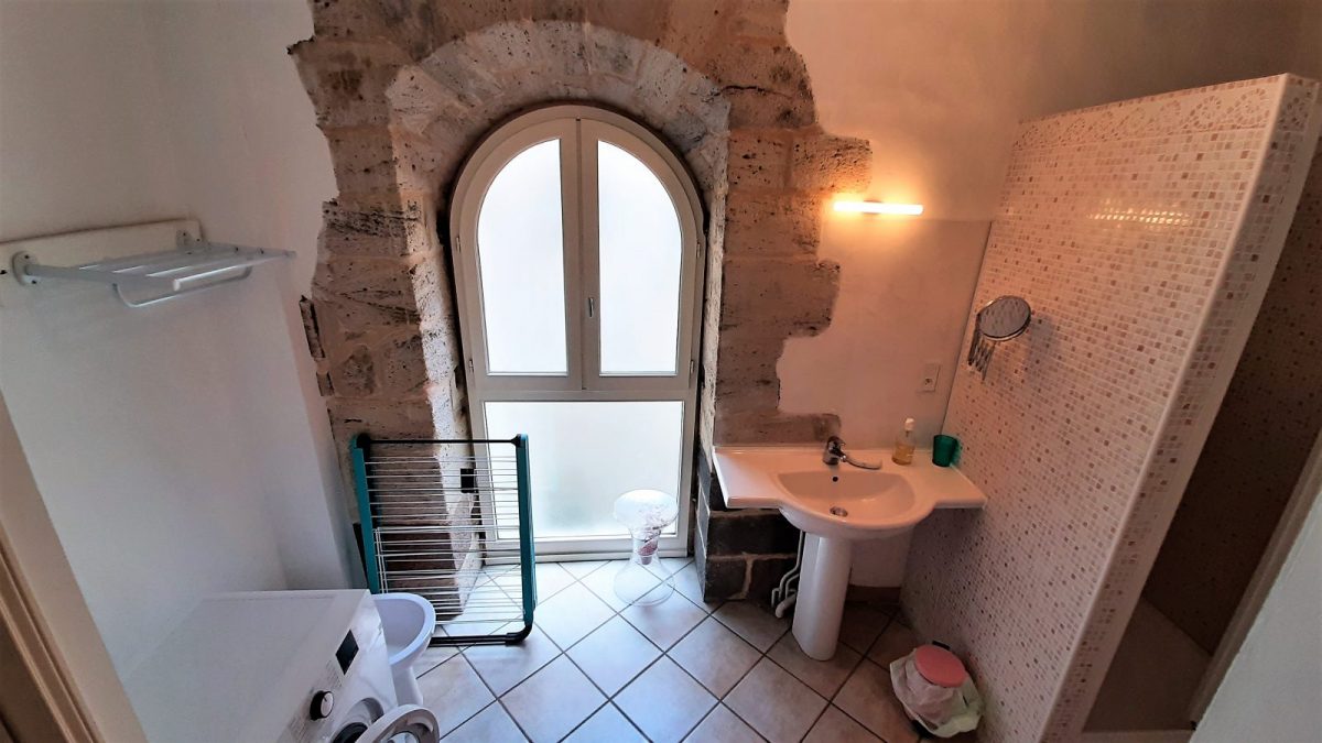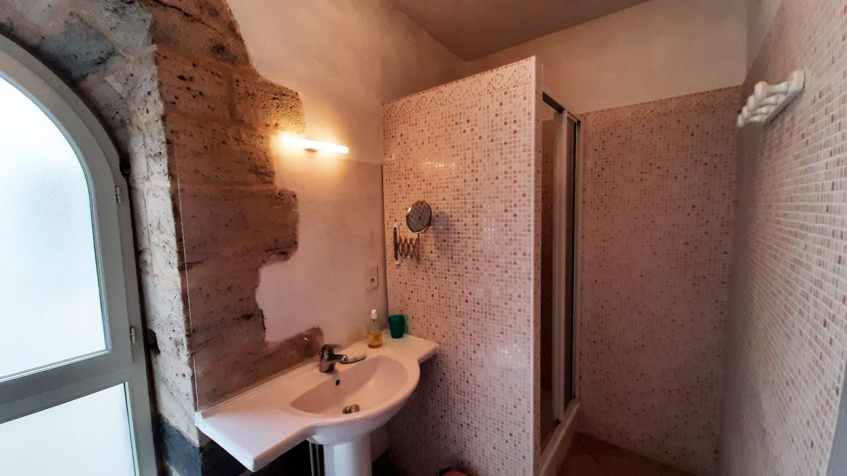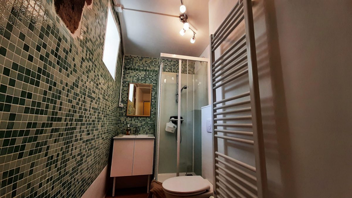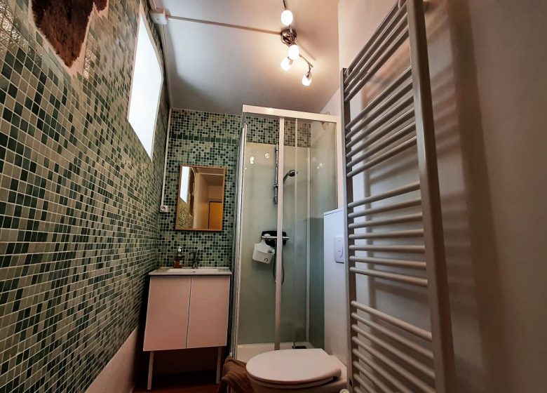 Salle d’eau indépendante et commune aux chambres de ce 1er étage : douche, lavabo, lave-linge, placard avec portes coulissantes (rayonnages), radiateur.