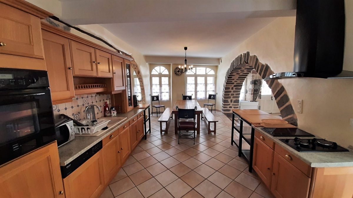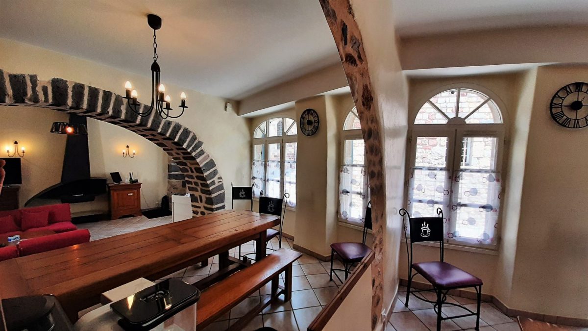 Cuisine incorporée (2 tables de cuisson : 2 feux gaz et 2 foyers à induction, hotte aspirante, four électrique, four à micro-ondes, lave-vaisselle, évier un bac avec égouttoir et robinet vintage (mélangeur), cafetière électrique, vaisselle, ustensiles et batterie de cuisine, … Grande table en bois avec bancs et chaises.