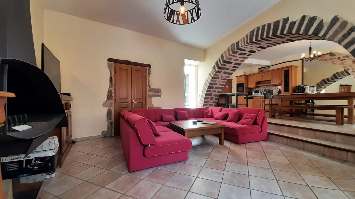 Rez-de-chaussée : grande pièce à vivre (env. 50 m2) : espace salon avec TV à écran plat, canapés, fauteuils, table basse, espace cuisine-salle à manger.