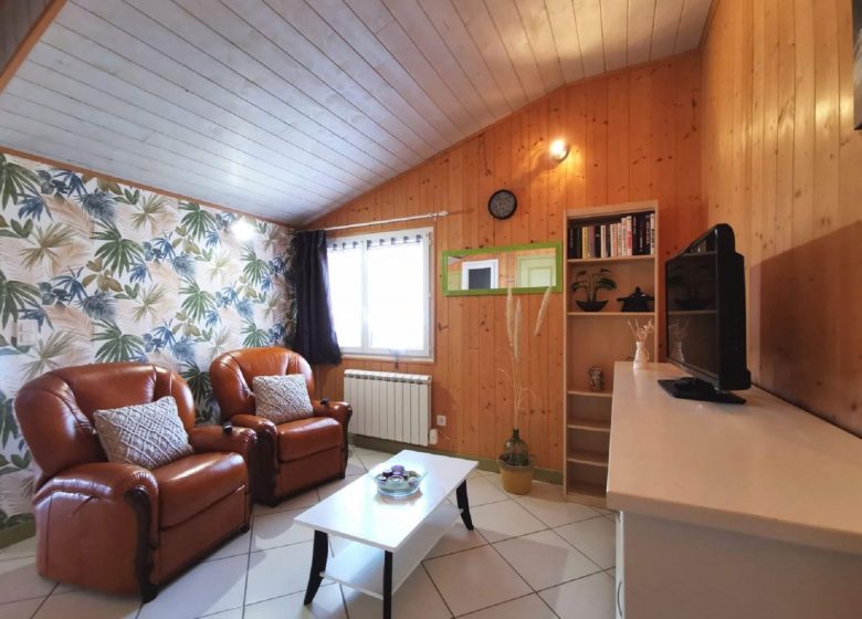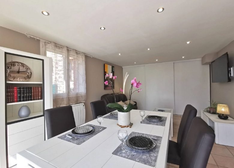 Au rez de chaussé le gîte est composé d'une salle de séjour avec table à manger et coin salon. Une cuisine à l’équipement très complet et des toilettes complètent cet étage.