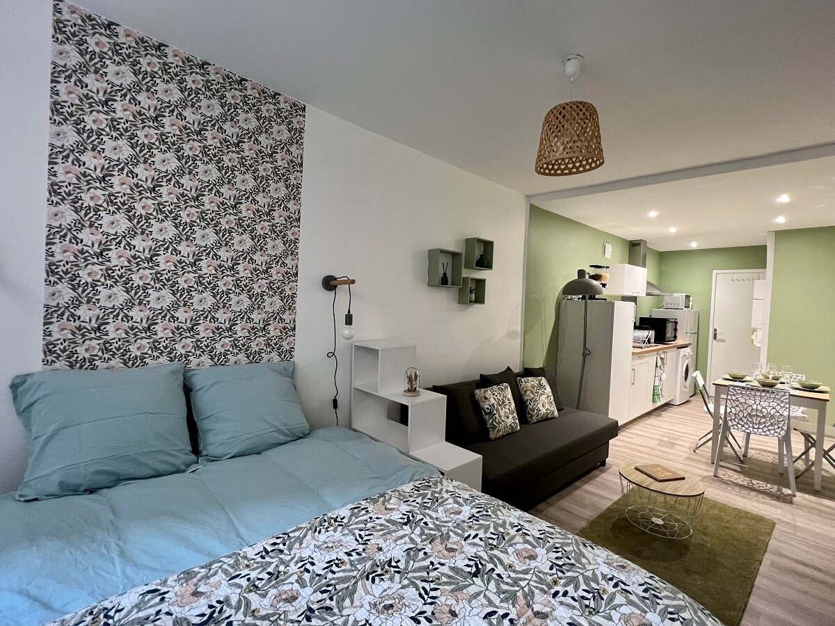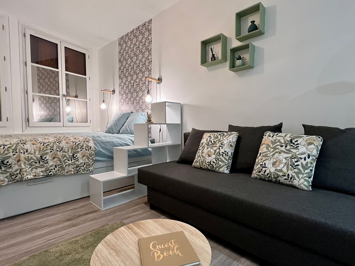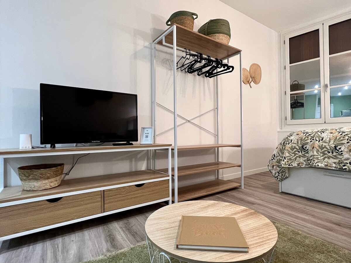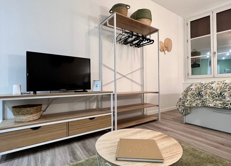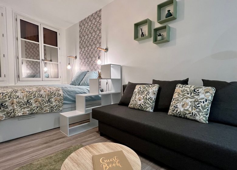 • Séjour cosy : canapé convertible, écran plat, table basse, enceinte Bluetooth.