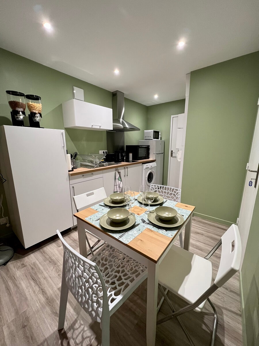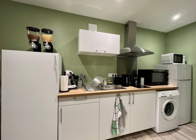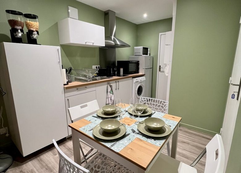 • Cuisine ouverte : équipée (vitrocéramique, frigo, four, micro-ondes, Senseo, bouilloire, etc...) et espace repas pour 4 personnes.