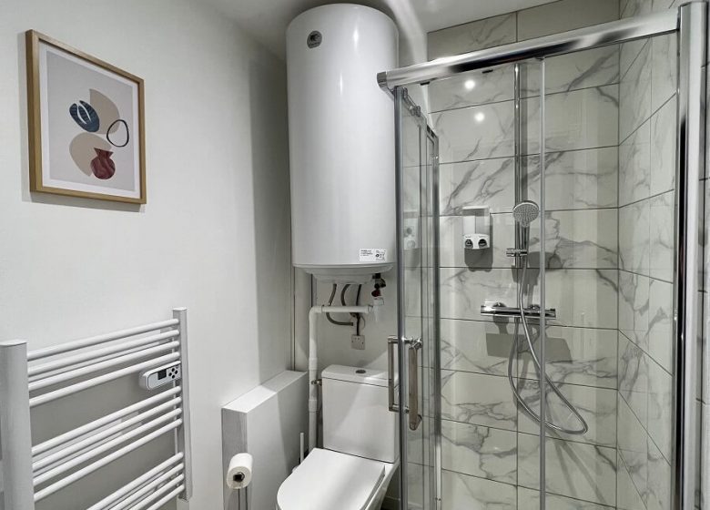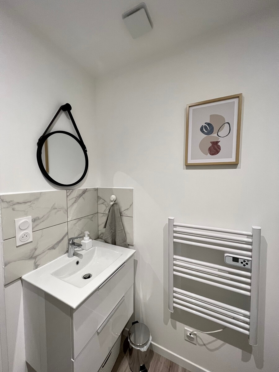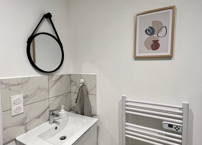 • Salle de bain moderne : douche à l’italienne, sèche-serviettes et sèche-cheveux.