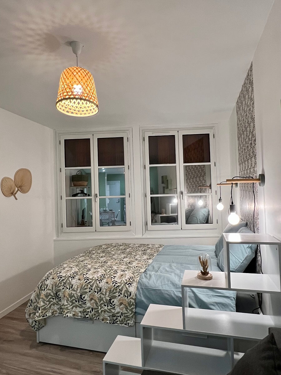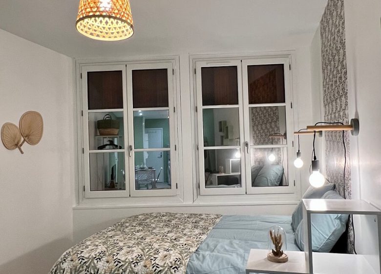• Coin nuit : lit double 140x200, matelas mémoire de forme, linge de lit inclus.
