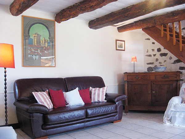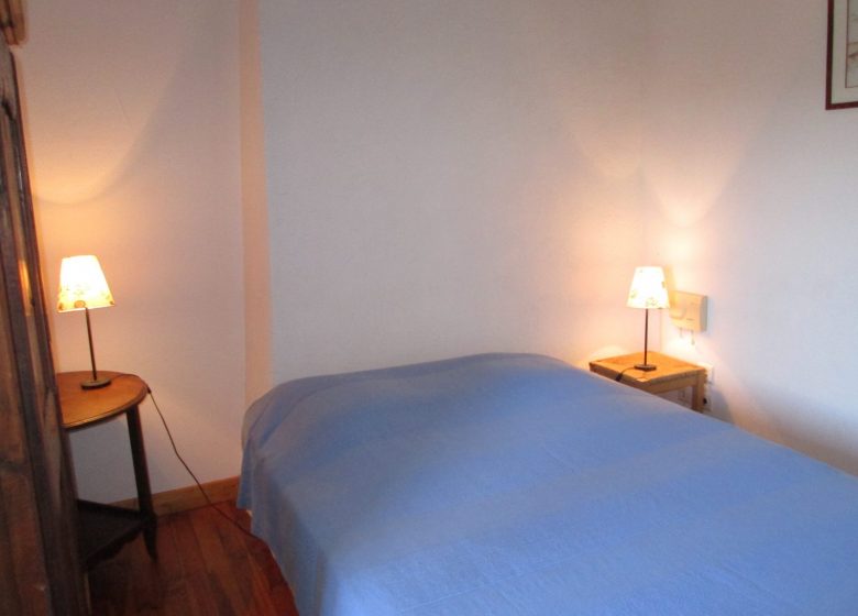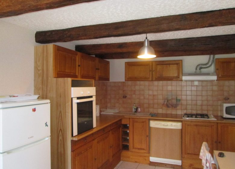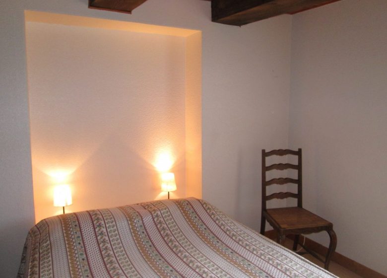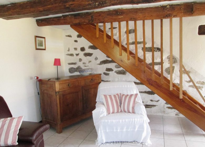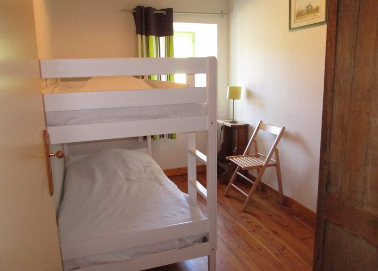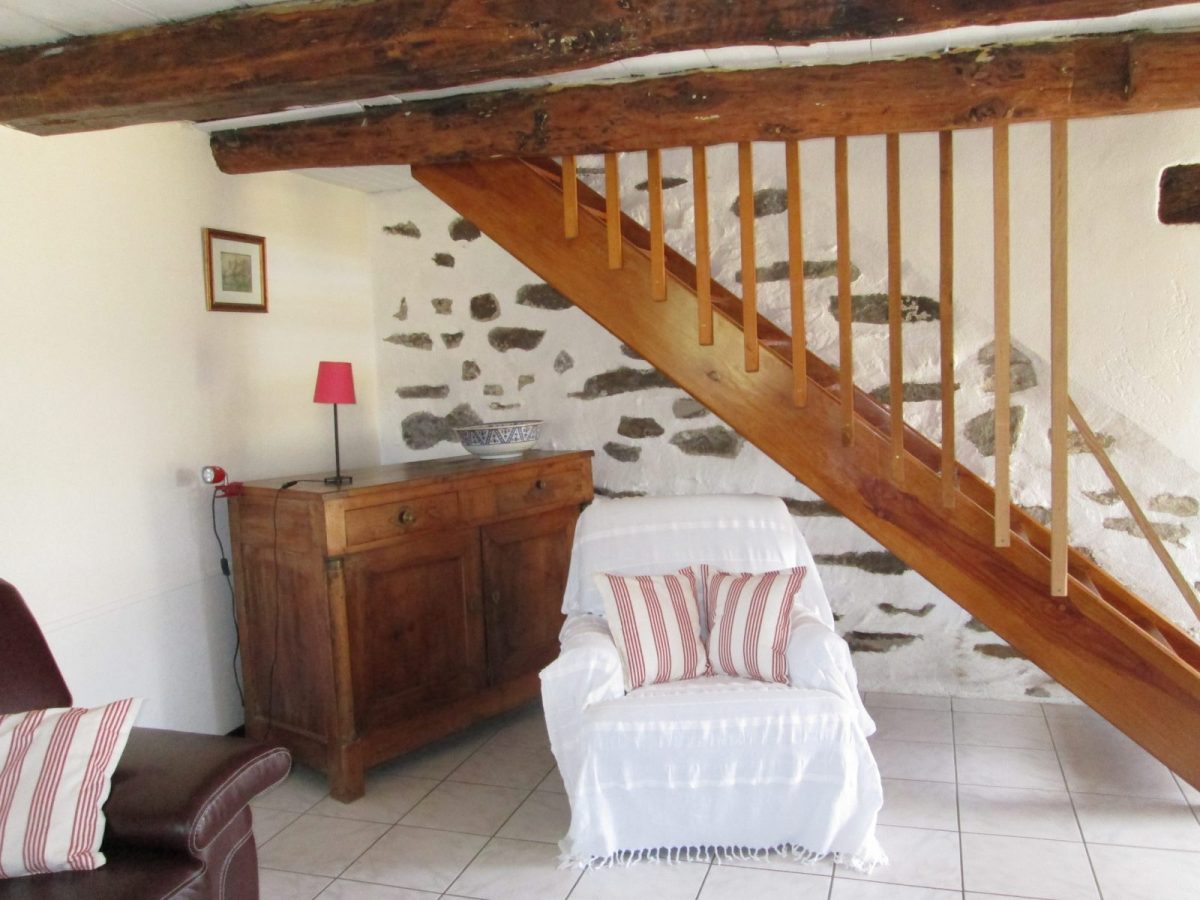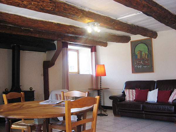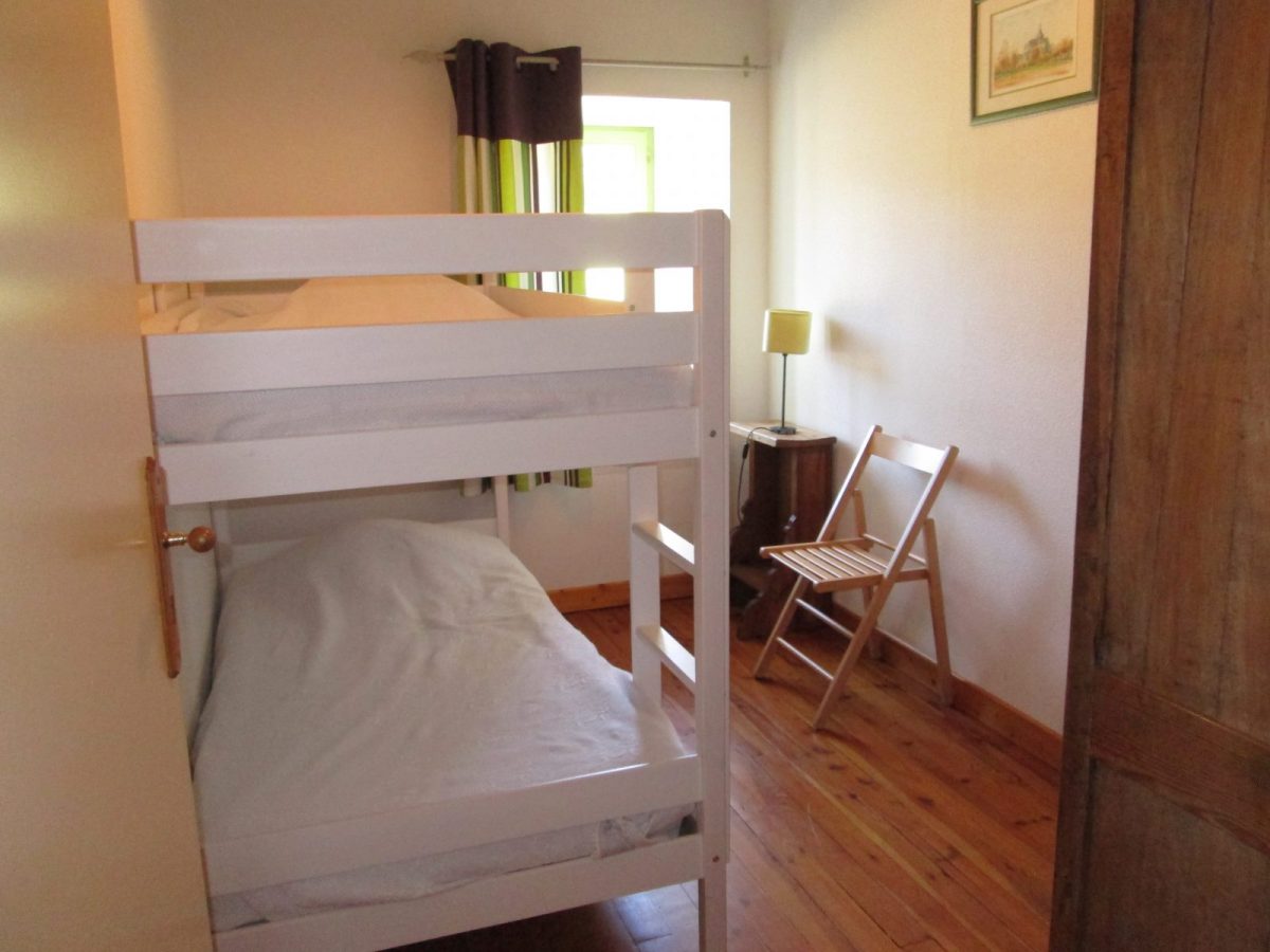 Séjour-salle à manger : buffet, table ronde + 8 chaises, canapé, fauteuils, poêle - cheminée.. Escalier bois. A l'étage : 3 chambres doubles (2 lits en 140x190 et 2 lits superposés 1 personne en 90x190). Salle d'eau avec douche, lavabo et WC communicant fermé. + un WC indépendant. Chauffage électrique. Terrain privatif à la location et clos de murs avec mobilier de jardin. Equipement bébé (lit, chaise-haute, ...). Equipements de loisirs communs avec le propriétaire : baby-foot, ...