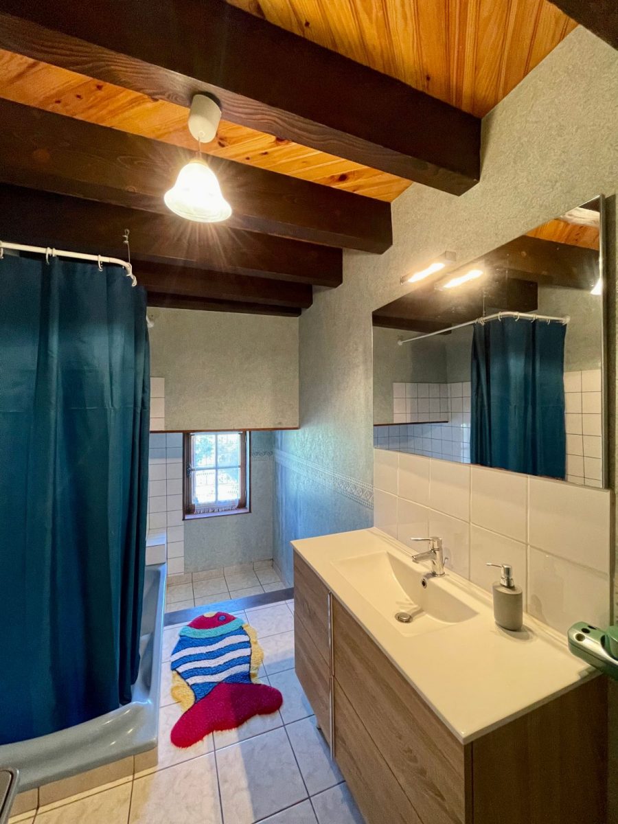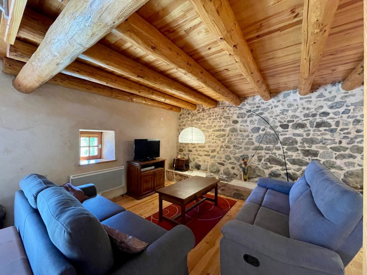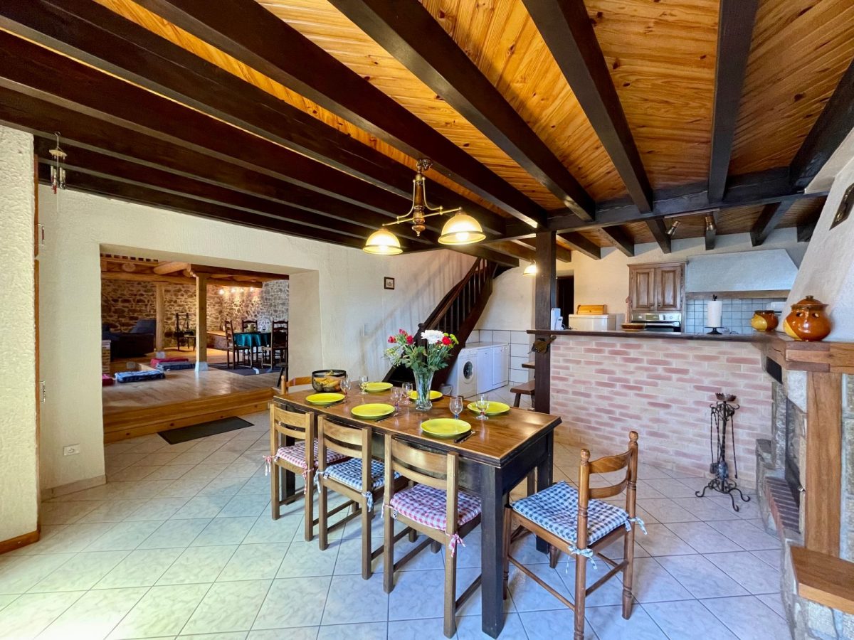 Rez-de-chaussée : salle à manger-cuisine (congélateur, cheminée), grand séjour (TV, poêle à bois) dans une ancienne étable restaurée, salle de bain, wc.