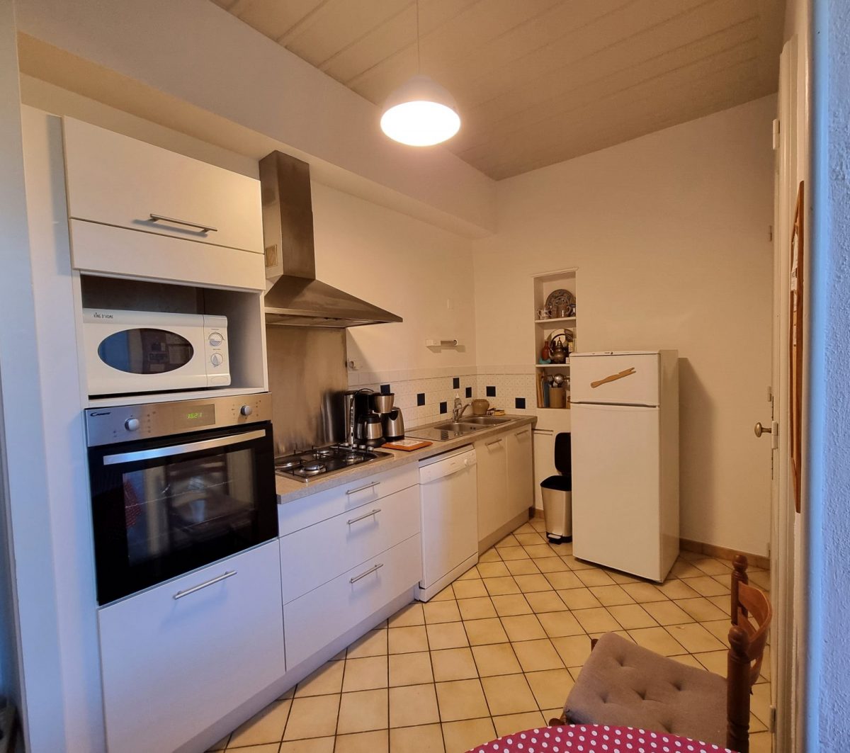 - Cuisine entièrement équipée : évier, hotte aspirante, table de cuisson en Inox (3 feux gaz et une plaque électrique), four électrique, four à micro-ondes, lave-vaisselle, réfrigérateur grand format avec congélateur ****, cafetière électrique avec verseuse isotherme, bouilloire électrique, grille-pain, cocotte-minute, mixeur plongeant, batteur électrique, appareil multi crêpes party Tefal, … Vaisselle, ustensiles et batterie de cuisine, table ronde, …