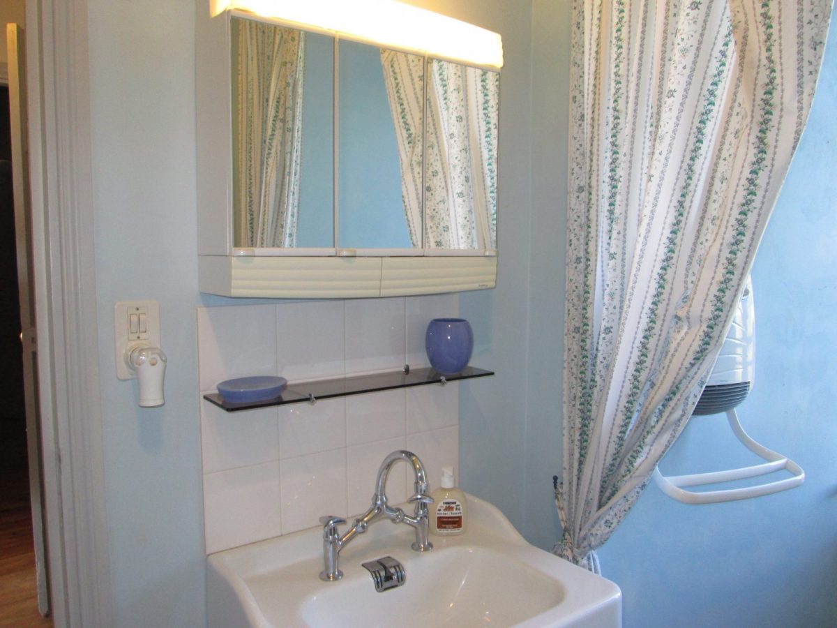 - Salle d’eau (petit espace) : douche avec porte vitrée et vasque sur plan meuble. Patères et porte-serviettes. Produit lavant pour les mains et gel douche, … Fenêtre.
