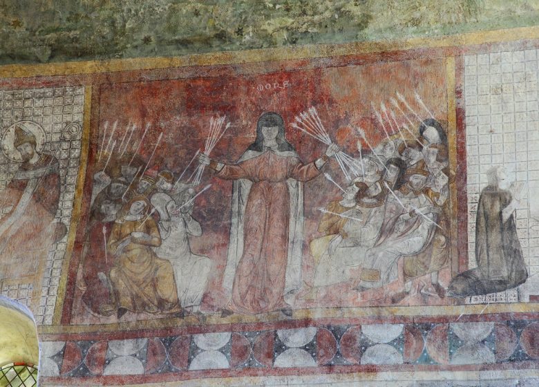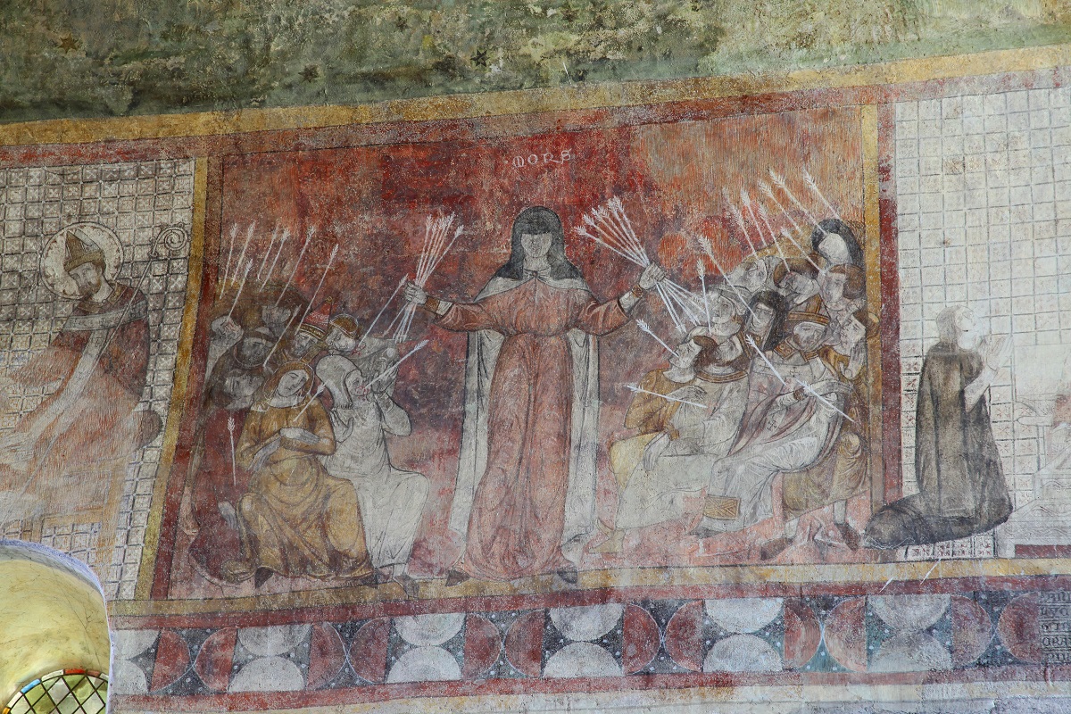 L'église recèle aussi un remarquable ensemble de peintures murales de l’Ecole Italienne (XIVe s) : scènes de la Passion, unique et très curieuse allégorie de la Mort Noire.