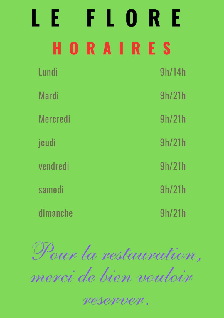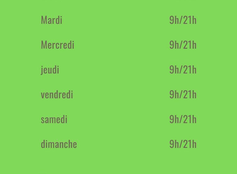 Ouverture le lundi de 9h à 14h. Le mardi, mercredi, jeudi, vendredi, samedi et dimanche de 9h à 21h.